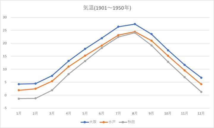 ▲ 大阪市、水戸市、秋田市の月平均気温を比較