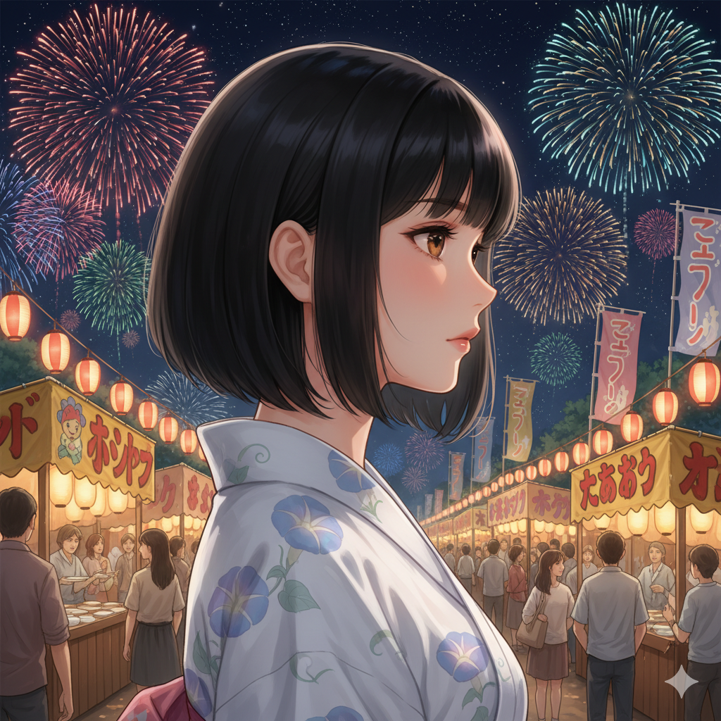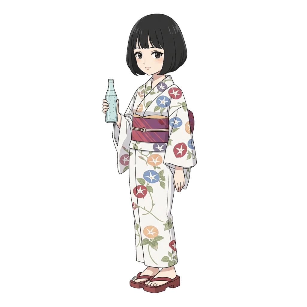 黒髪のボブで、白地に朝顔柄の浴衣を着て赤紫の帯を締め、赤い鼻緒の草履を履いている。