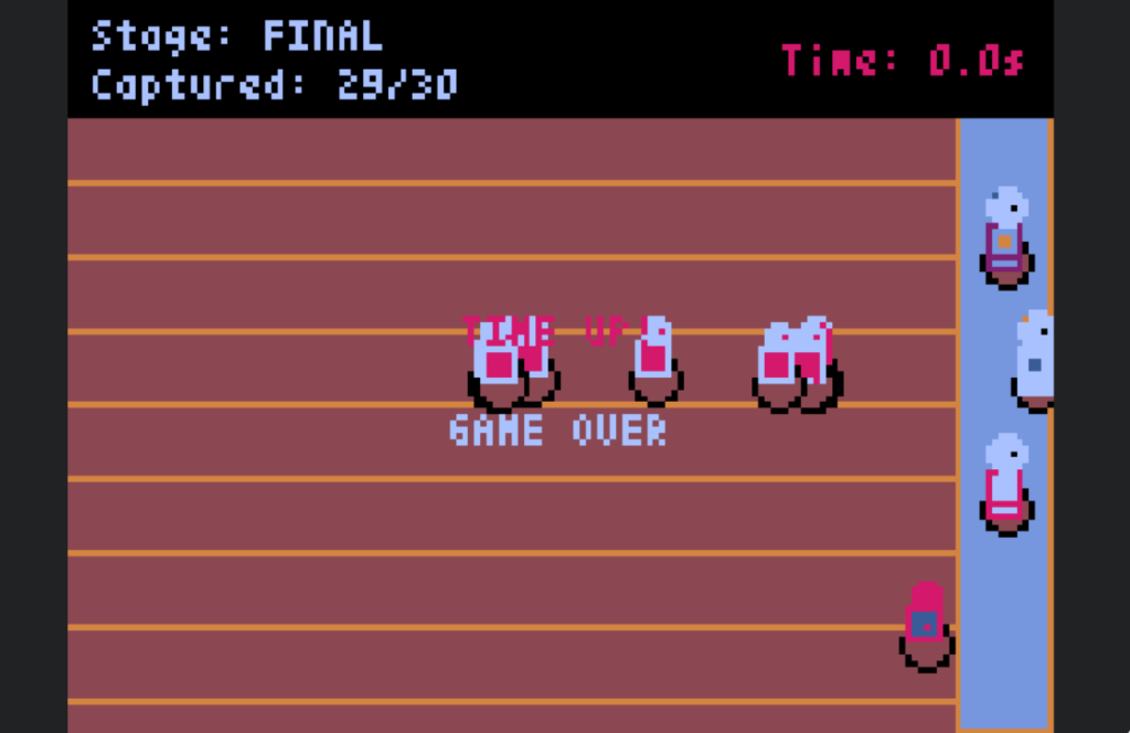 最後にそれまでかかった時間が表示、GAMEOVERの表示、タイトル画面に戻る。